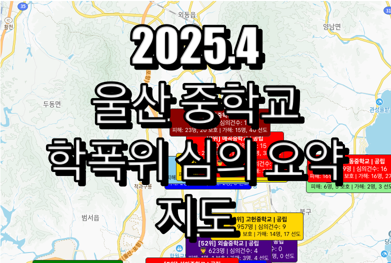 이번 자료는 2025년 4월 학교알리미 공식 발표자료를 기준으로, 2024년에 일어난 울산 중학교별 학교폭력대책심의위원회 관련 상황을 지도위에 표현하였습니다. 자녀교육을 고민하는 부모님들에게 꼭 필요한 자료입니다.