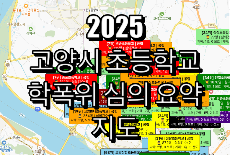 이번 자료는 2025년 4월 학교알리미 공식 발표자료를 기준으로, 2024년에 일어난 초등학교별 학교폭력대책심의위원회(학폭위) 결과를 지도위에 표현하였습니다. 자녀교육을 고민하는 부모님들에게 꼭 필요한 자료입니다.