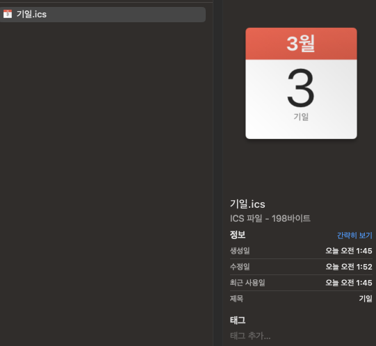 해당 파일은 Mac OS에서는 다운로드 후 해달 파일을 더블 클릭하면 캘린더앱이 실행되어 이벤트를 추가할 수 있습니다.