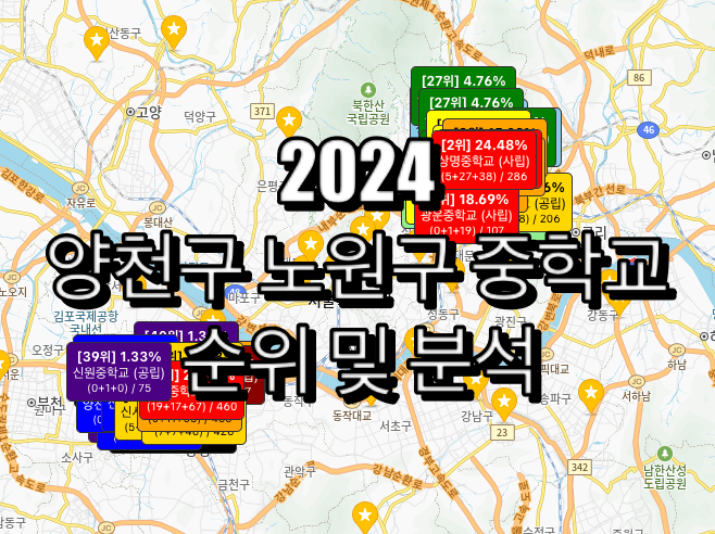 서울에서 교육열이 높은 지역 중 하나인 양천구 & 노원구의 중학교별 특목고 및 자사고 진학률을 분석했습니다. 이번 포스팅에서는 2024년 9월 학교알리미 공시 자료를 바탕으로 양천구·노원구 중학교의 특목고 및 자사고 진학률을 분석하고, 지도와 함께 각 학교 정보를 정리해보았습니다.